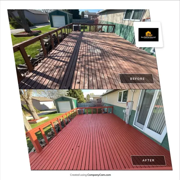 At Pro Task Services LLC, we recently assisted a client in Scottsbluff by transforming their old, hail-damaged deck into a renewed, eye-catching outdoor living space. We used Sherwin-Williams SuperDeck in Cape Cod Red to breathe life back into the weathered wood, making minor rot repairs along the way to ensure the deck’s longevity and enhanced appearance.